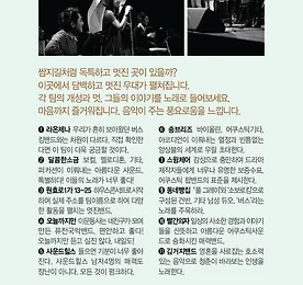 OOZE 썸네일형 리스트형 OOZE(우즈) - 팀 경력사항 2010년 결성 2012년 6월 OOZE 1ST EP 'Song for you' - Members : 장아름 ( Vocal ), 송지은 ( Piano ) piano & vocal 두 악기가 만들어 내는 여백과 소편성된 악기들이 이루어내는 사운드가 있는 그대로 전해졌으면 하는 마음에서 어쿠스틱한 사운드를 지향한다. - 팀 활동내역 에반스, 오뙤르 등 클럽 공연 다수 KBS '사랑과 전쟁' OST - 팀원 소개 송지은 (piano) 작사, 작곡. 서울예대 실용음악과 건반전공 졸업 CCM밴드, 뮤지컬 '풋루즈' 건반 세션 강균성, 포맨 등 콘서트 세션 ------------------------------------------------------------------- 장아름(vocal) 작.. 더보기 뷰티풀서울페스티벌 아티스트소개 더보기 이전 1 다음